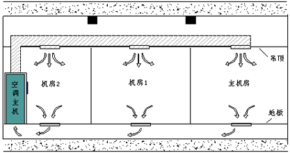 如下圖所示,若三個房間從吊頂到地板都采用獨立的空調系統,那么將機房1和機房2劃作一個區域或劃為兩個單獨滅火區都是可行的。但如果采用一臺精密空調為三個房間服務且為“上送風,地板下回風”方式這三個房間就必須劃分成一個滅火區域,藥劑儲備應該是上者的3倍或1.5倍,對工程的投資影響是比較大的。除過滅火劑和噴放管道布置要作為一個保護區考慮外,探測范圍也應該分塊進行探測但還是一個探測區域,警報區域也應該按照一個區域來設置和聯動。